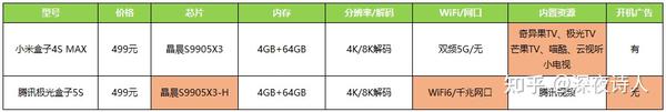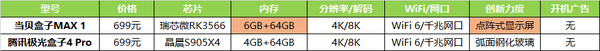 当贝盒子MAX 1和腾讯极光盒子4 Pro是两款高端旗舰级产品,价位相同,配置稍有区别,前者拥有6GB+64GB超大内存,RK3566芯片在解码H.264/H.265格式的片源时拥有突出的画质优化能力,播放出的画面会更加清晰,支持杜比透传;后者采用的是晶晨S905X4芯片,解码VP9格式的片源时更具有优势,且支持HDR 10+;杜比音效等。