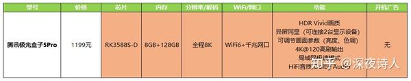 腾讯极光盒子5 Pro是一款无论在性能、配置、功能、接口方面都拉满的电视盒子,在目前国内的电视盒子产品中,单从配置来说没有一款能与它相比,RK3588S-D芯片的性能已经超过了智能电视所搭载的芯片;内存配置对于普通用户来说几乎是过剩的;支持蓝牙5.2、真HDMI2.1接口、USB3.1接口,USB-C支持DP接口,还可以再连一台显示器;唯一有变化的是这台电视盒子不支持杜比视界了,改成支持HDR Vivid了,也是稍微有点遗憾的地方,毕竟杜比视界的普及要更加广泛。