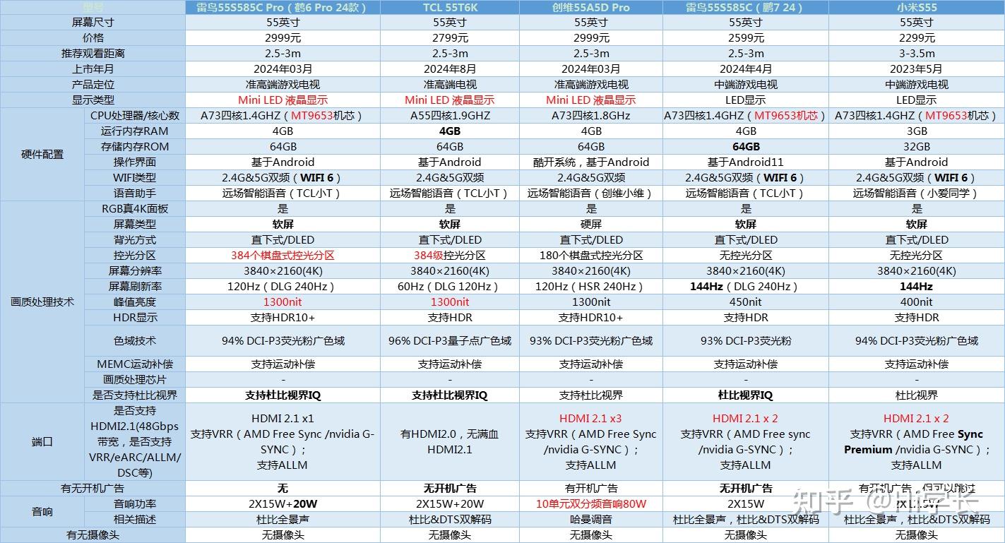 鹤6 Pro 24款是鹤6 24款升级版,从准高端电视升级成定位更高的Mini LED 液晶电视,也是主打性价比,和小米电视S55 Mini LED这款属于针尖对麦芒的型号,甚至在硬件参数上雷鸟鹤6 Pro 24款更胜一筹……怎么说呢,针对意味很明显喔。