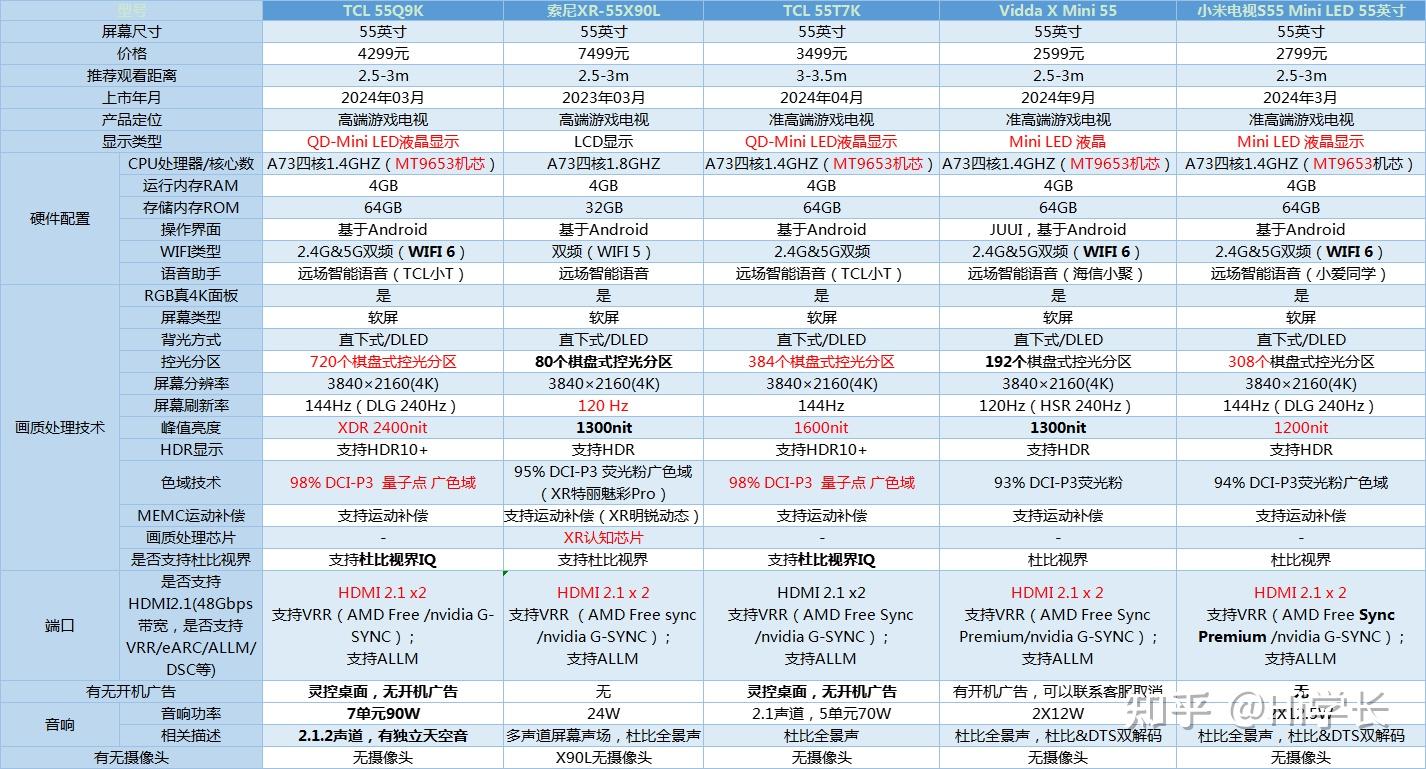 25年有MT9653机芯+双路HDMI2.1靠前;旧款机芯、单HDMI2.1靠后;无HDMI2.1垫底;