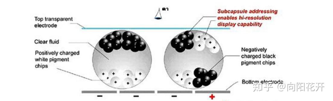 这里简单科普一下电子墨水:电子墨水本身由许多的“胶囊”组成,胶囊里是液体,里面有许多带电的白色+黑色小颗粒,通电后,通过电泳的方式进行移动,形成黑色和白色的字体。