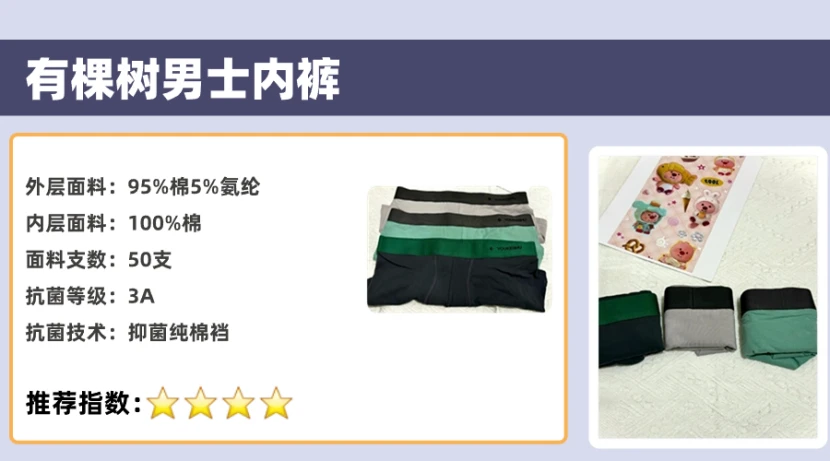 在抗菌标准方面,有棵树男士内裤目前仅达到3A级,这一点上相比于其他品牌比较落后。面料方面,有棵树男士内裤采用了高达95%含量的50支精梳棉,确保了内裤的柔软性和细腻度。