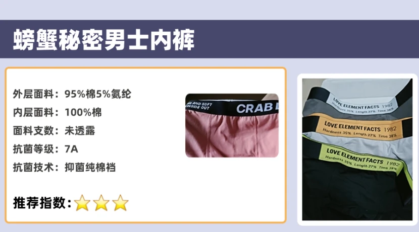 综合来看,螃蟹秘密的这款男士内裤在设计上时尚年轻;在材质上,则选用了优质的有机棉和纯棉材质,保证了穿着的舒适性。