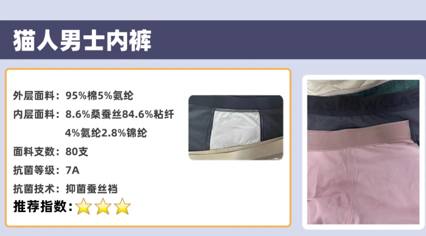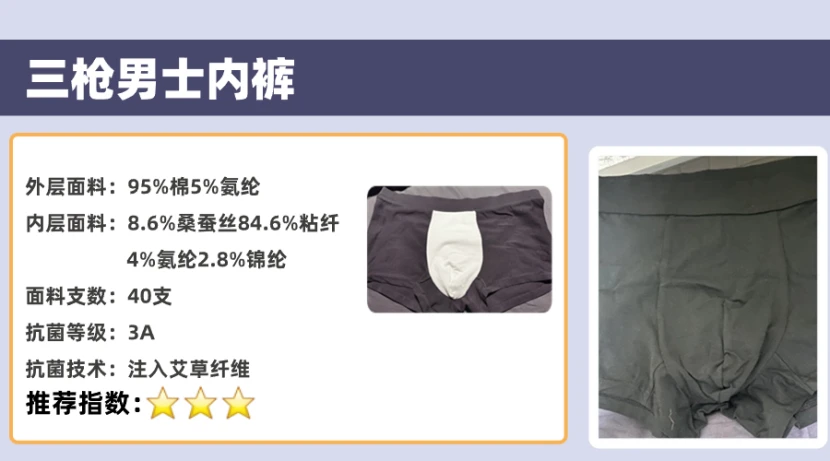 经过综合实测,三枪男士内裤在包裹性方面表现优异。然而,其面料支数仅为40支,相较于市场同类产品,柔软度仍有待进一步提升。在抗菌性能方面,该内裤仅符合3A抗菌等级。