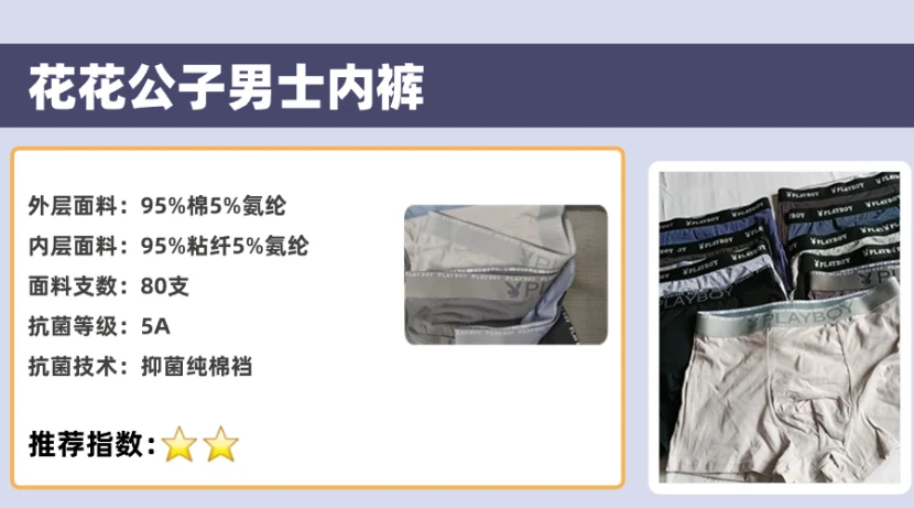 花花公子这个牌子应该大家都知道的,这款男士内裤采用80支新疆长绒棉作为面料,确保了不错的透气舒适性和良好的回弹力,从而有效避免内裤变形。在内档设计上,该内裤达到了5A抑菌等级,经过100次水洗后仍能保持强大的抑菌功能。此外,其单向导湿里档设计能够降低空气阻力,进一步提升透气性,确保穿着干爽舒适。