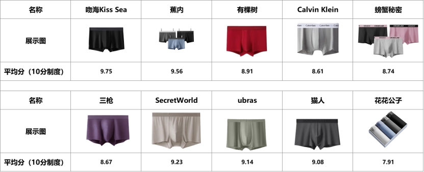 虽然面料比较重要,但实际的舒适感是由面料、版型、设计等多个方面组成的,而且不同的人穿着也会有不同的感受,所以舒适感是一种比较主观的评价。而测试方法我们将这10款男士内裤遮挡LOGO后分别邀请了7位小伙伴进行试穿并打分。(每一次试穿都是全新的)