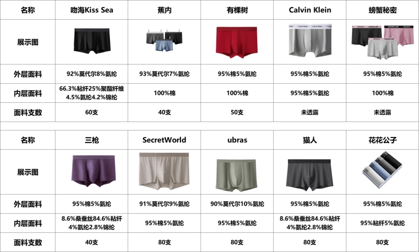 内裤最注重的就是使用的面料以及支数,市面上常见的分为“纯棉、莫代尔、冰丝”三种,也有一些会采用特殊不同的材质,下面分别罗列出十款男士内裤的材质以及面料支数,看看这十款男士内裤表现如何!