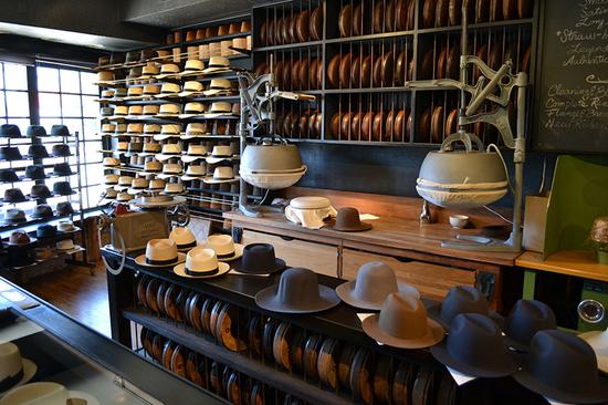 Bates 虽然不大,但制作工艺极好,款式品种齐全,从普通的平顶帽,一直到最正式高顶礼帽,高级吸烟帽,以及极品级的巴拿马帽,在这家店几乎可以找到所有你想要的款式。