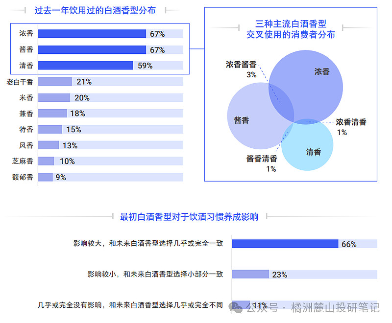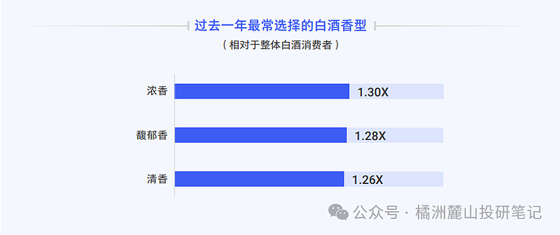 其中,在白酒香型的选择上,这一人群也体现较整体市场不同的差异,他们对浓香型、 馥郁香型、清香型产品更为偏爱。