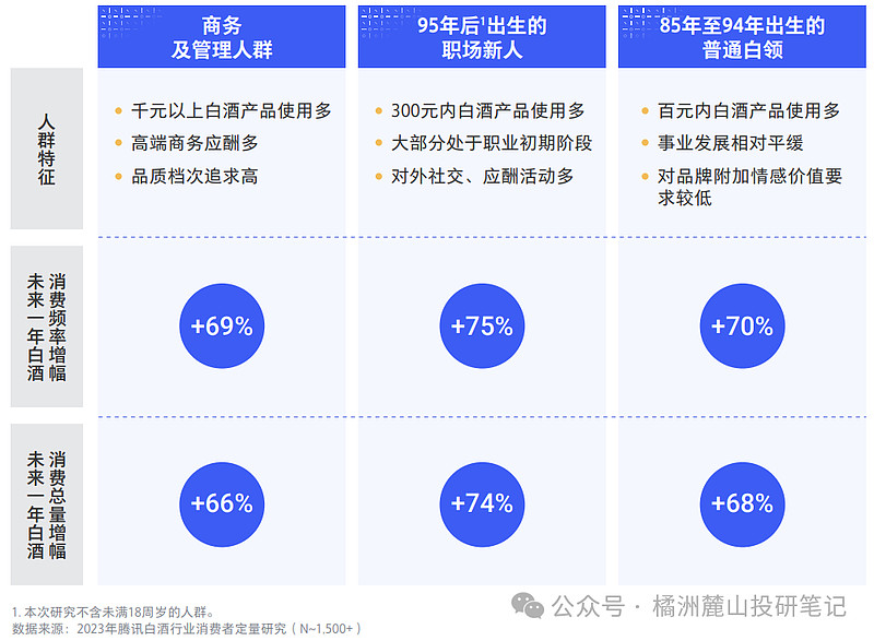 三类人群在白酒的消费总量和频次上具备较高的增幅,分别是以工作应酬为核心场景的商务及管理人群、95年后出生的职场新人、85年至94年出生事业相对发展平缓的普通职员,这三类人群值得深入关注。