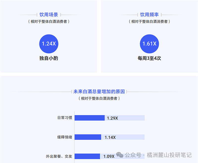 对于普通白领而言,他们的饮用场景较为特别,更愿意独自小酌,频次约每周3至4次更多,高于市场平均水平的每周1至2次。