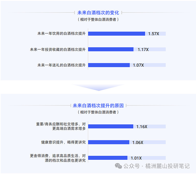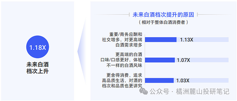 由于未来重要/商务应酬和社交的增多,对更高端白酒的需求增加、变得更追求高品质,对白酒的档次和品质的要求也相应地增加。与此同时,健康问题也颇到商务及管理人群的重视,喝的更好尤其重要。