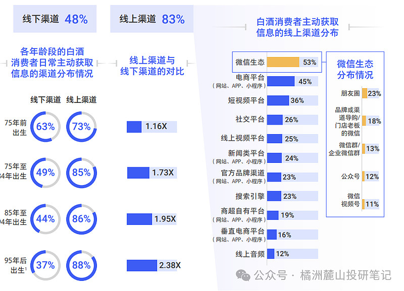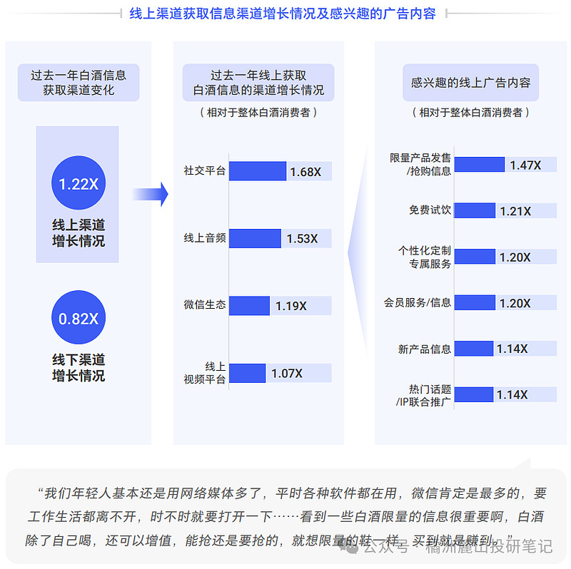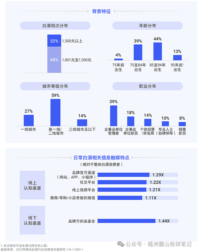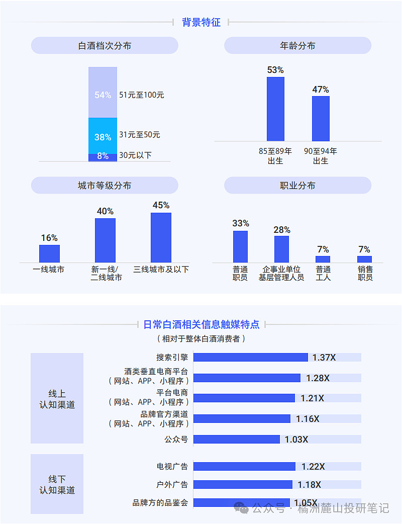普通白领偏好百元内的白酒产品,日常综合多类线上线下渠道获取白酒相关资讯。