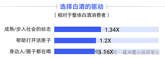 消费特征一:渴望获得步入社会/成熟标志的认同、希望更好地融入到社交活动和社交圈子是使用白酒的主要驱动。