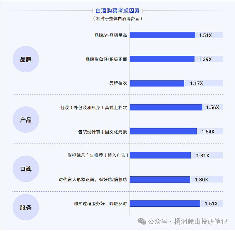 对白酒的选择,商务及管理人群保持精益求精的态度,多方位全面讲究。因此在白酒的购买上的考虑和要求多且高,在产品、口碑、品牌、服务等多方面都提出全方位的综合要求。其中,品牌因素是最为重要的考量,一方面商务及管理人群会格外留意品牌是否足够畅销、具备高国民度,另外也会关注品牌形象是否积极正面。而在产品上,商务及管理人群尤为关注产品的包装设计是否足够体现档次,是否呈现中国传统文化风格、以及是否经常能在营销中见到、服务体验是否到位等。