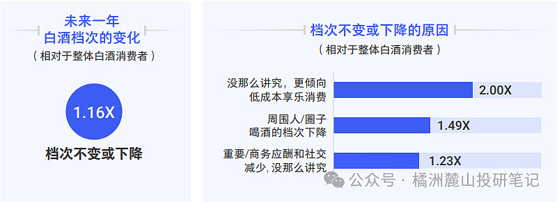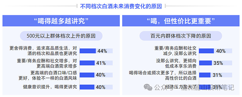由于商务应酬和社交场合减少以及身边熟人饮酒档次下降等多重因素共同影响这一人群饮酒档次的选择,这一人群在未来一年白酒消费档次不变或者下降的意愿更为突出。