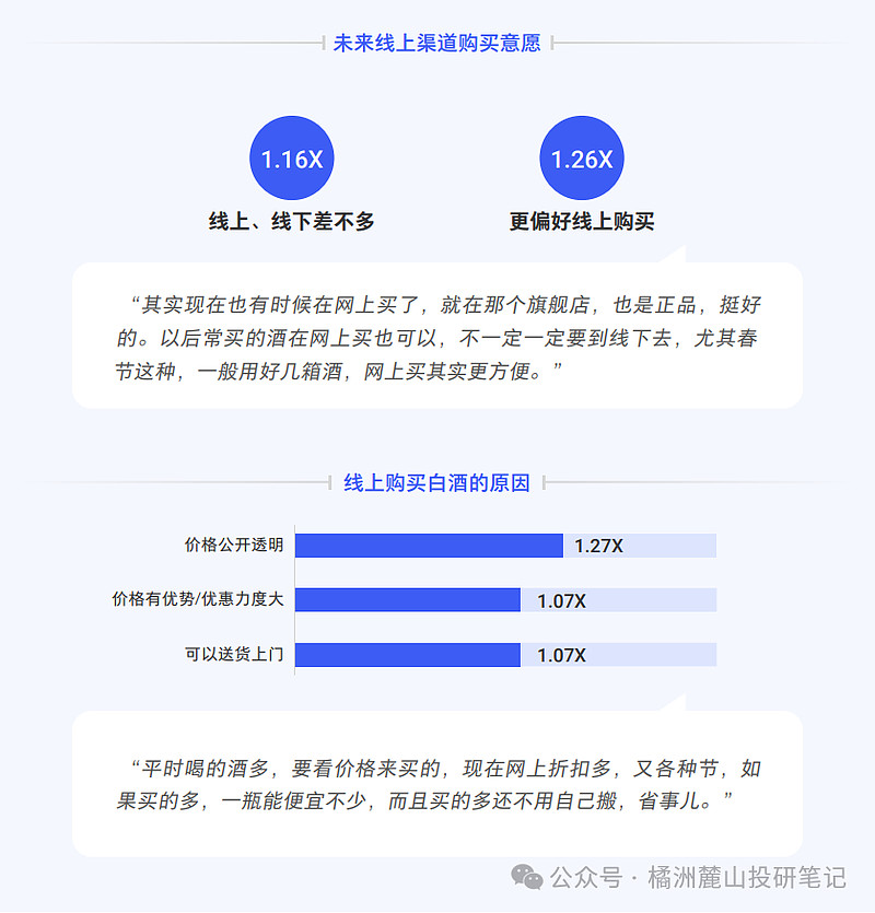 对线上渠道购买白酒产品接受度更高,未来会更愿意尝试在 线上购买,价格公开透明、优惠力度、便捷是主要因素。