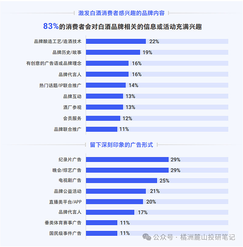 对于白酒消费者而言,品牌相关的内容仍旧是与消费者沟通的重要内容,尤其是品牌酿酒工艺、品牌历史/故事,品牌颇有想象的广告语、品牌代言人等都是能够深入影响消费者对品牌偏好的重要内容。