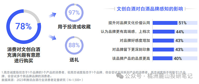 78%的消费者表示愿意购买文创白酒,其中88%愿意购买用于送礼,97%愿意购买用于投资或收藏,可见文创白酒的市场发展潜力大。此外文创白酒承载中国文化元素,有利于品牌文化价值提升和品牌形象塑造,提升千元以上白酒人群对品牌的好感度, 同时辐射百元内塔基产品动销。