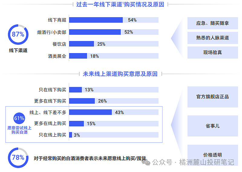 线下作为白酒消费者的首要购买渠道,源于其非常便利,尤其针对临时突发场合。另一重要原因在于白酒消费者通常会长期选择在自己熟悉的渠道购买,和销售渠道或者门店老板建立了长期的情感信任。再者线下渠道对于消费者而言易于进行现场验真和产品包装检查。但线上渠道也由于其独特的优势而在未来呈现势能,线上优势在于带来更透明的价格和优惠政策,以及异地购买的便捷性。