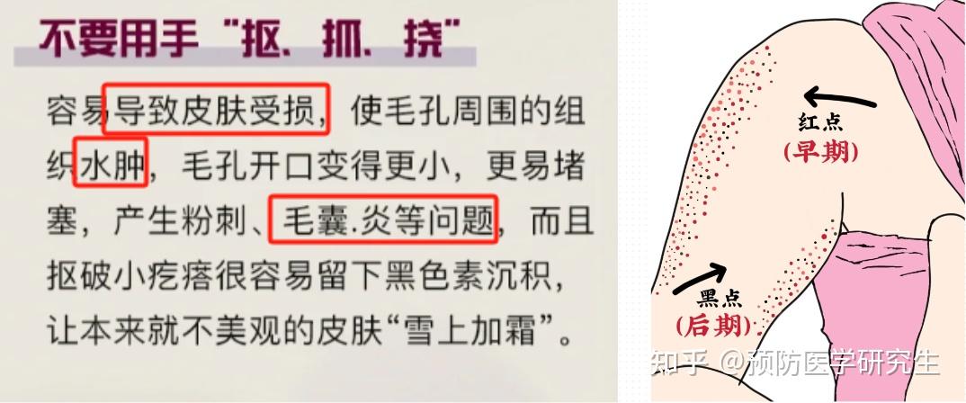 一不小心抠破了,还会留下红点,后期发展成密密麻麻的黑点,特别难看!!