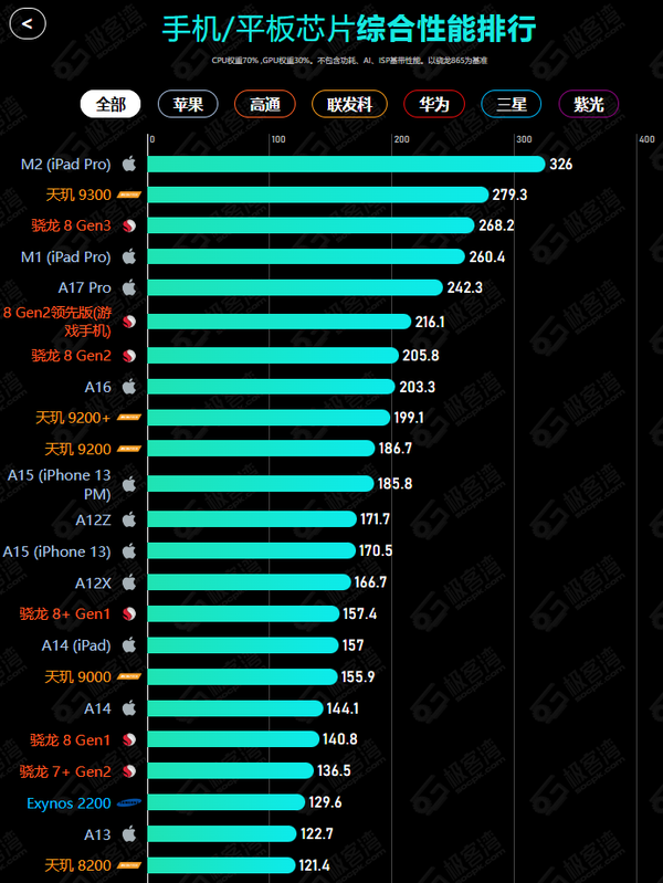 而在这些模块里面,我们最需要注意的就是CPU跟GPU的型号,前者影响手机程序运行的速度,后者影响图像表现效果,如游戏画面的流畅度跟画质的高低。但如果你对决定各个SoC的之间的区别太复杂,也可以参考极客湾的这个SoC综合性能排行进行选择。