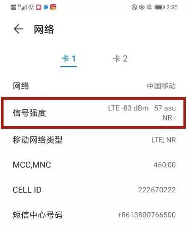 有一种特殊情况,如下图“移动网络类型”同时显示LTE、NR标识,但“信号强度”一栏“NR”并没有显示具体信号强度,这种情况下就是我们所说的“假5G”,显示为5G,但手机实际并没有使用5G网络,这种情况一般是由于5G信号达不到使用标准,但运营商为宣传5G而在部分区域设置的标识。