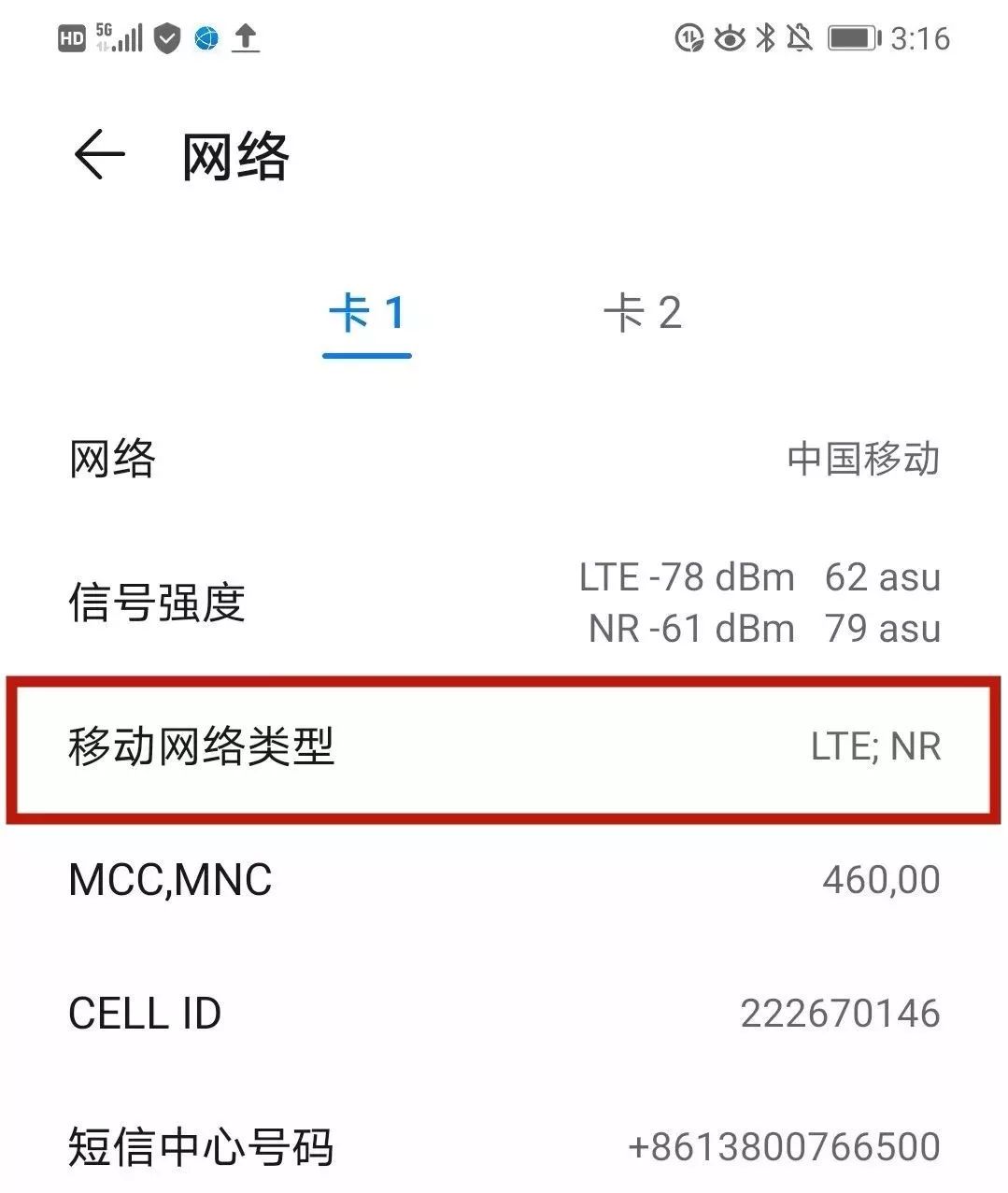 “移动网络类型”一栏同时显示 LTE、 NR标识