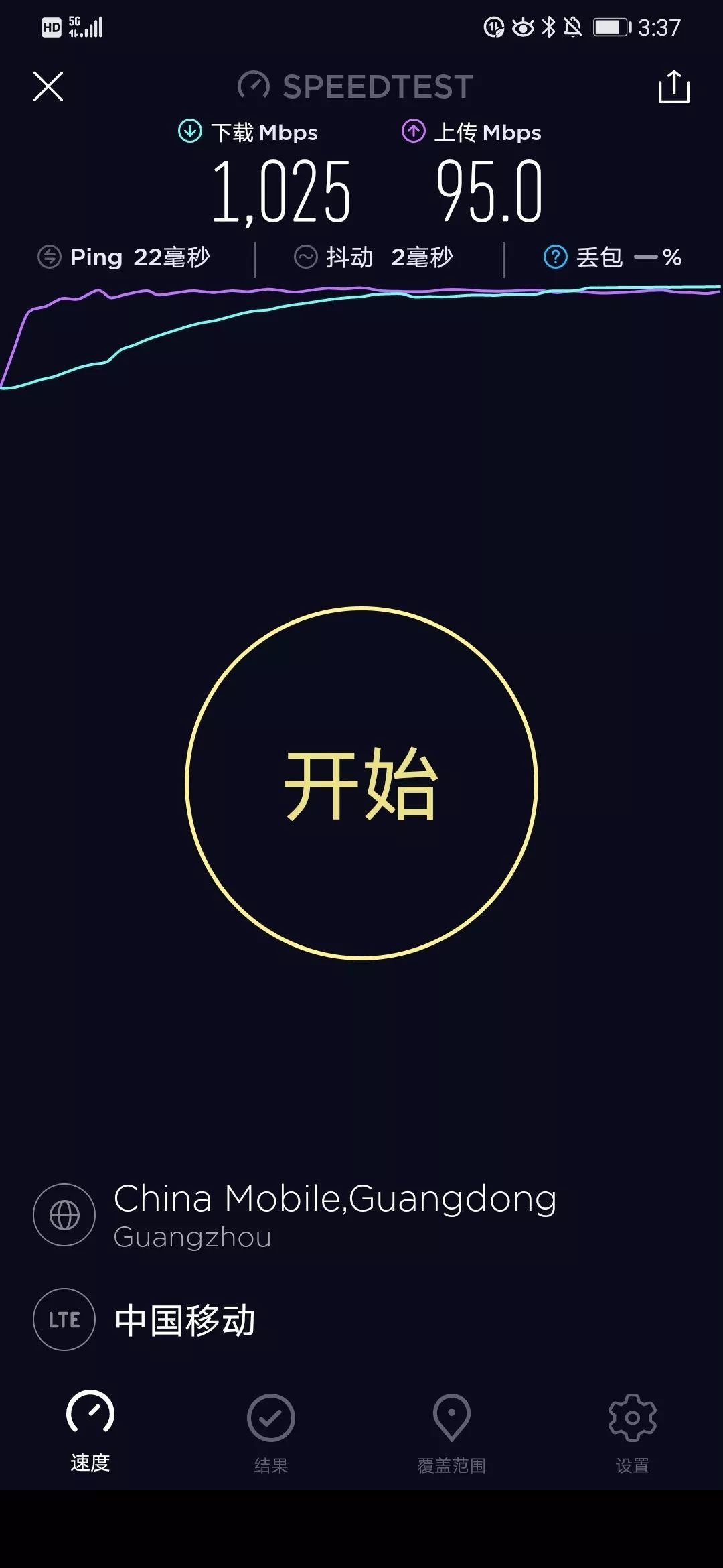 方法一看起来有些复杂,那么我们有一个简单粗暴的方法可以快速鉴别您的手机使用的到底是“真5G”还是“假5G”,请看小编用第三方APP测速软件speedtest实测的速率: