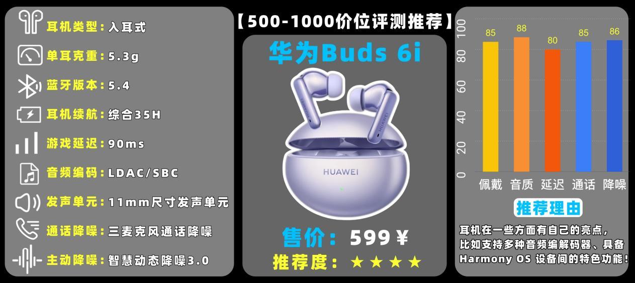 500-1000以下价位评测推荐7、华为Free Buds 6i蓝牙耳机售价:599¥