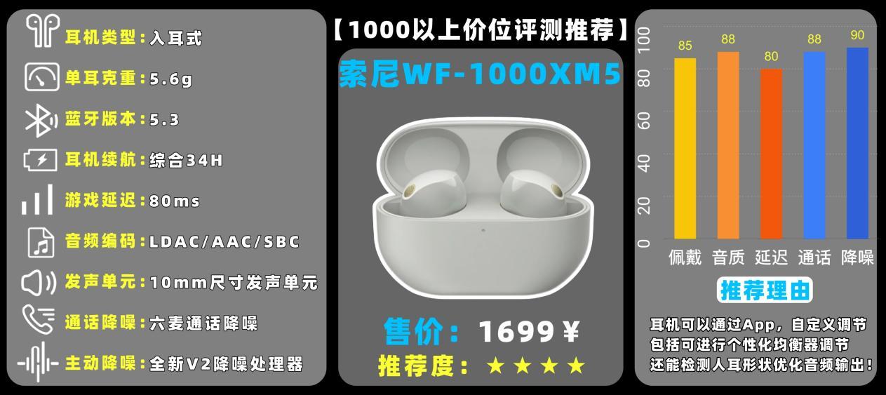 1000-2000以下价位评测推荐10、索尼WF-1000XM5蓝牙耳机售价:1699¥