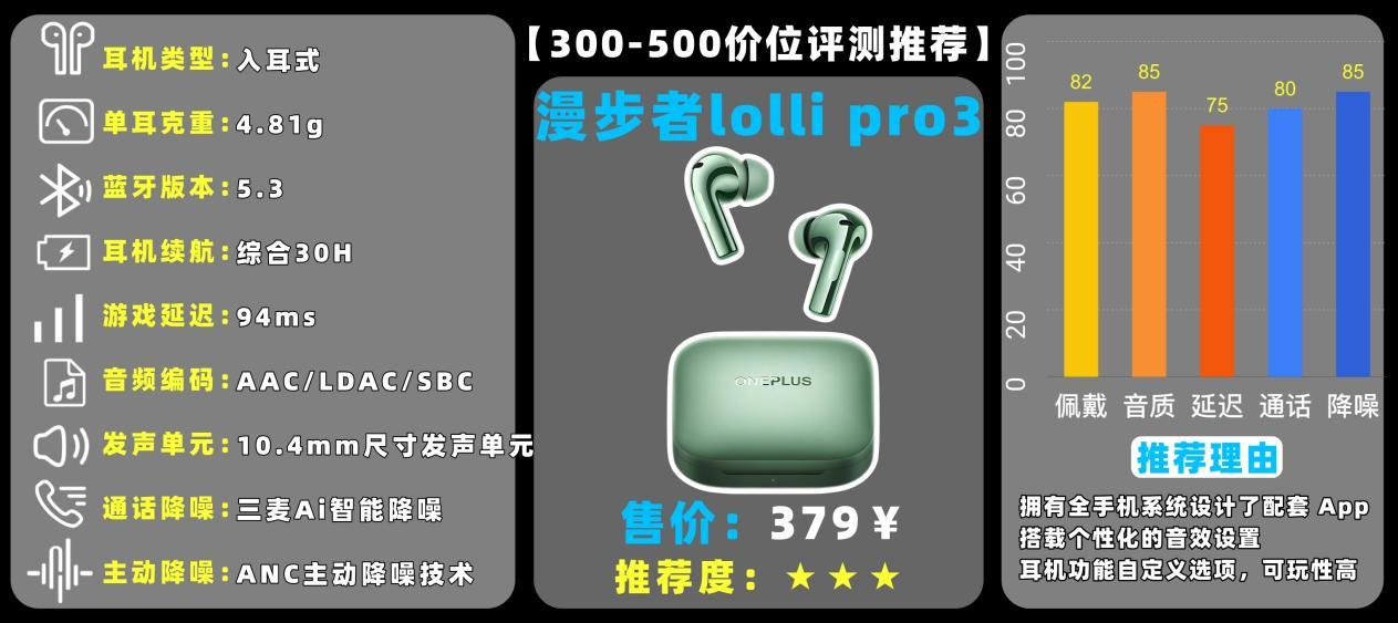 300-500以下价位评测推荐5、漫步者lolli pro3蓝牙耳机售价:339¥