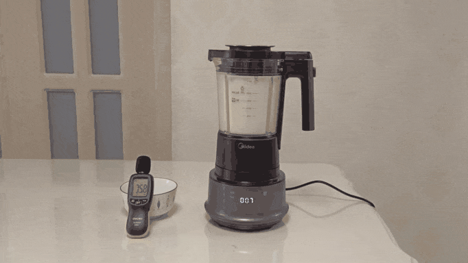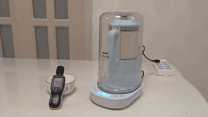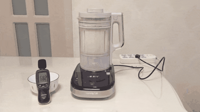 分好几轮搅打,大体上维持边煮边间隔搅打的模式,搅打时噪音维持在64-68分贝间,它的声音实际上是那种低低的「呜呜」声,没有尖锐的刺耳声,比较柔和,甚至让人感觉不到这是「噪」音,确实可以称得上是「柔音」了。放在客厅搅打,进房间关了门就完全听不到了,它的声音是真的轻。