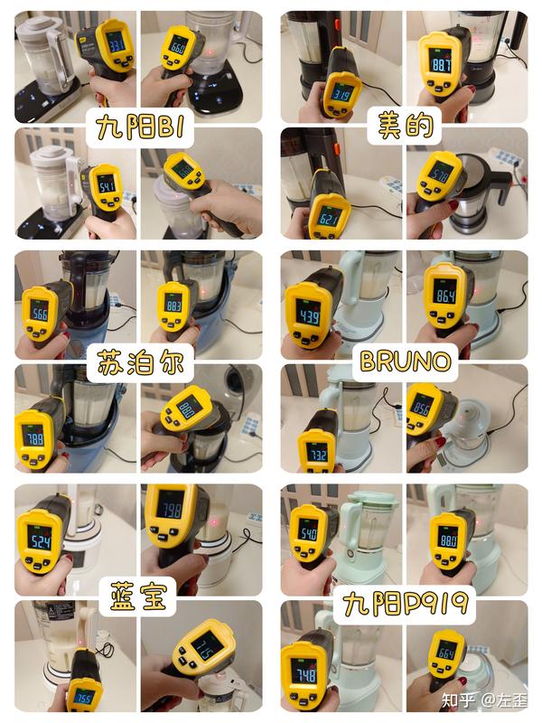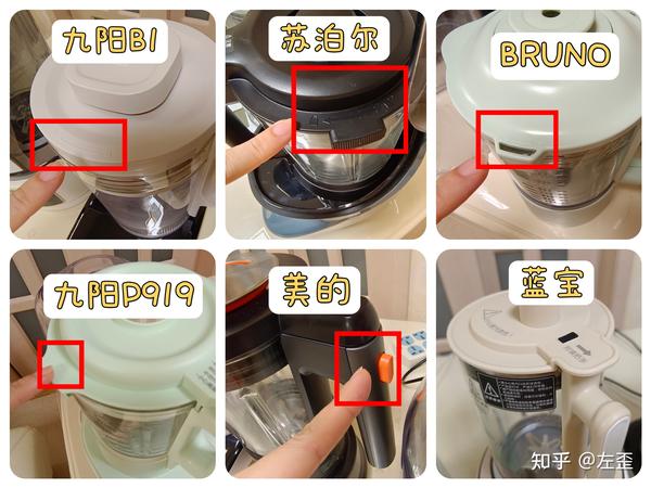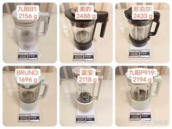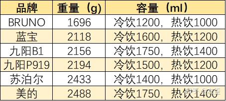 基于以上内容,我给出的分值如下,黑色代表1星,白色代表半星,这部分最高分为3颗星:九阳B1:★★★美的:★☆苏泊尔:★★BRUNO:★☆蓝宝:★★九阳P919:★★☆