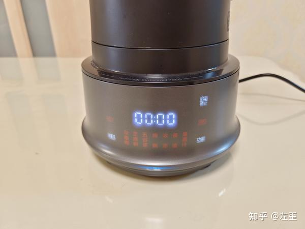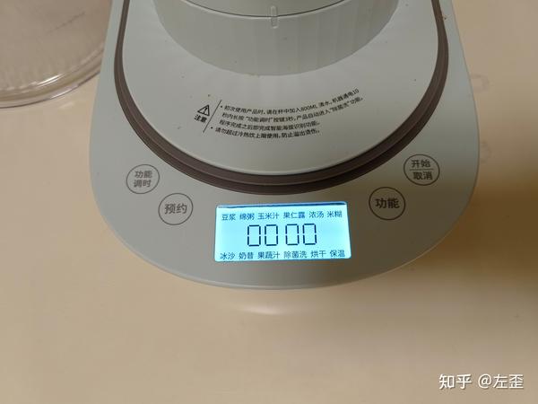 操作面板是竖直设计,设置了6个常用的食谱菜单(共7个,另有1个是保温选择),奇怪的是竟没有「豆浆」这个常见选项。操作时需稍微弯腰或低头才好辨别食谱,菜单无法直接触摸选择,需触摸「功能」显示键,才能切换选择,也就是说,如果不小心选错食谱,需要再按一轮,跳过另外6个食谱后才能最终选择。除了食谱的功能键,还另有除菌洗、搅拌、搅磨模式键等功能键及其子菜单,选择和操作内容较多。