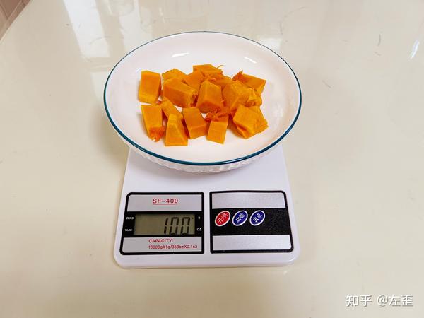 我把每份南瓜、大米和水量也都做了统一,分别为100g南瓜、80g大米(称重时已去除量杯、盘子重量)和500ml水。