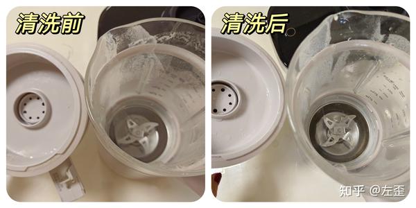 自清洁的整洁度。本次6款破壁机都有自清洗的功能,所以我在做完豆浆、拍完杯底照后,就给它们都来了一次自清洗,也就是装上各自需要的水量后,让它们在杯里自由地自我冲洗,以下图片左右各为自清洗前、自清洗后杯中的模样,一起来看看效果吧。