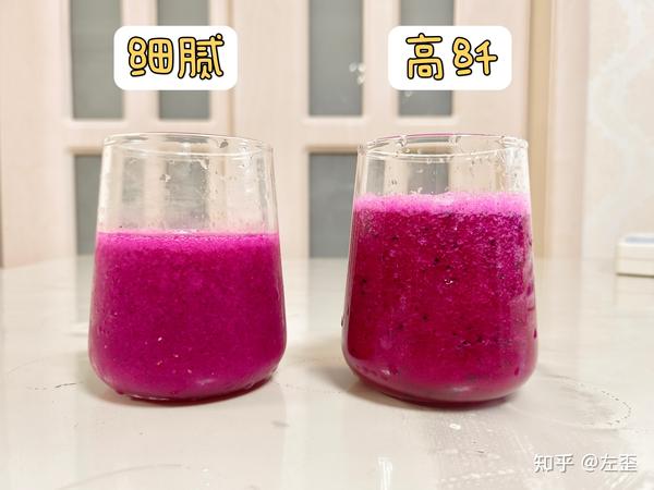 从图中大家可以清晰地看到,细腻口感的果汁,火龙果的黑籽几乎不见,搅打得非常碎,而高纤口感的果汁,火龙果的黑籽颗粒可见。