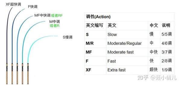 X-F(超快)、F(快):路亚竿稍较为灵敏,有利于路亚软饵的操作和精准抛投,是我们常说的感度好,能很快感知鱼的咬口,但容易跑鱼。MF(中快):性能居中,硬饵和软饵都能操作。M(中)、S(慢):适合操作硬饵,粘鱼性好不易跑鱼,简而言之就是容易感到鱼汛,对鱼线压力较小。国内大部分路亚竿都是MF和F调性,XF、M和S都比较少见,UL、L硬度更多F调,ML以上更常MF调。