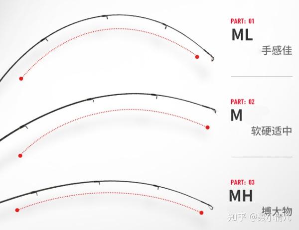 L适合小型鱼竿 ML、M通用型鱼竿 MH稍大型鱼竿直柄竿和枪柄竿都有四个硬度:L、ML、M、MH,枪柄竿有8个型号,直柄竿有5个型号,很多都已经断货。