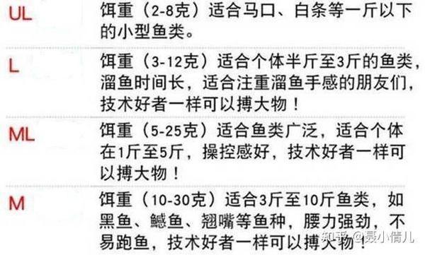 UL、L:适合小个体鱼,例如马口、白条等,常用拟饵是小克重的饵。ML,M,MH:适合中大型个体鱼,例如翘嘴、鳜鱼、鲶鱼等,常用拟饵是中克重的饵。H、XH、XXH:打黑专用(黑鱼),一般用大克重的饵。新手入门会将路亚竿的调性和硬度混为一谈,其实这两个并不是一个东西。强度指的是要竿子达到调性需要用的力,同样调性但是不同强度的鱼竿,所需要的负荷重(鱼重量)不同。