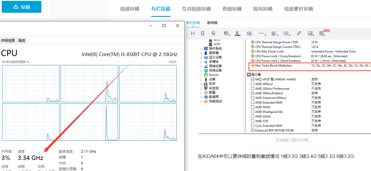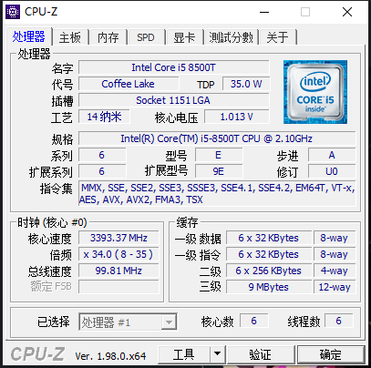 i5 8500t的基础频率2.1G 单核睿频3.5G 全核睿频3.2G