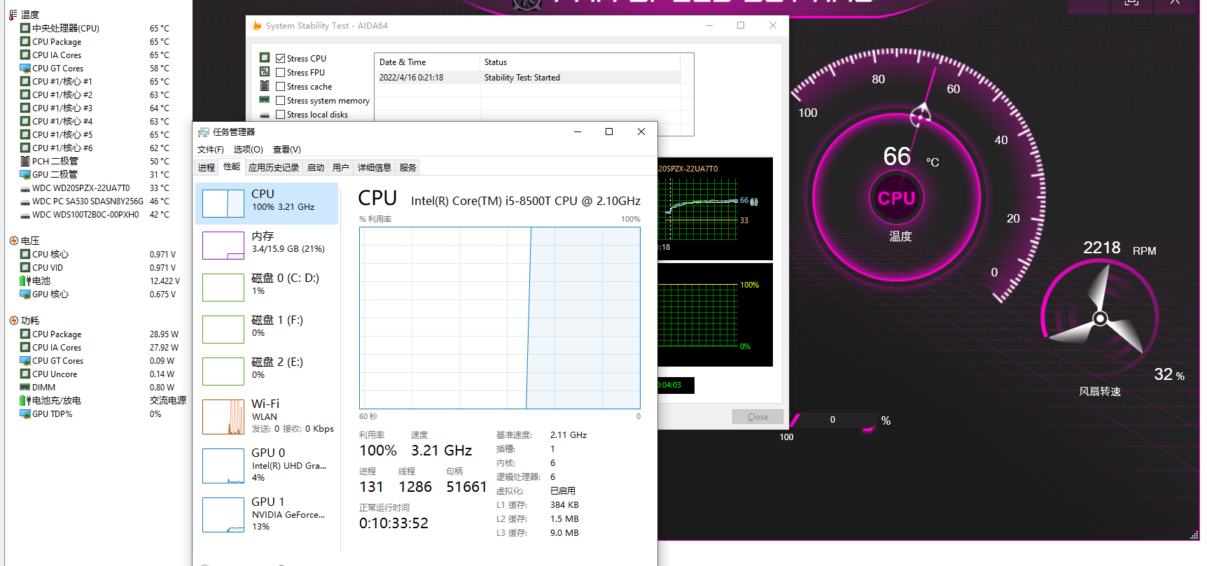 功耗30W左右.这个项目实在没什么测试压力可以跳过了,因为测试这项目时这笔记本风扇都懒得转,转速仅32%就把他压在60多度.这个转速就是平时待机时的转速