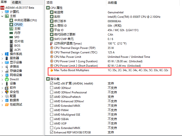 在AIDA64中可以更详细的看到睿频情况:1核3.5G 3核3.4G 5核3.3G 6核3.2G