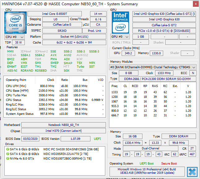 可以看到这颗i5 8500T和标压8500一样 都是6核6线,9兆三缓 且比9400/8400多了TSX指令集,这个指令集在8-9代的CPU只有X500以上才有.不过只对于一些模拟器用户作用较大.大多数用户用不上