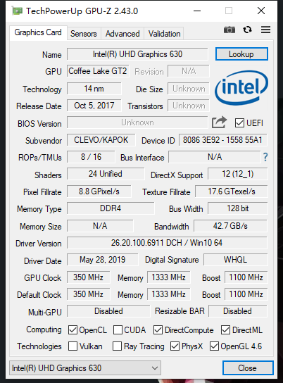 GPU-Z截图:核显为UHD630 最大频率1.1Ghz
