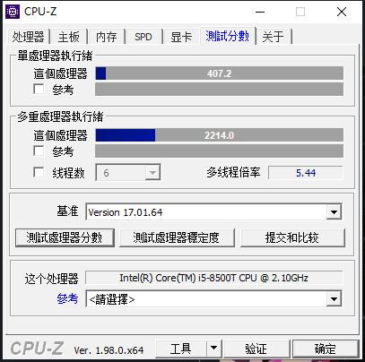 版本1.98 多核分数大概在2100-2200之间波动,测试时尽量关闭后台程序CPU-Z这个测试分数也仅供参考,这软件完全是一代版本一个分数 注意对比版本.图为1.98版本 单核407 多核2214