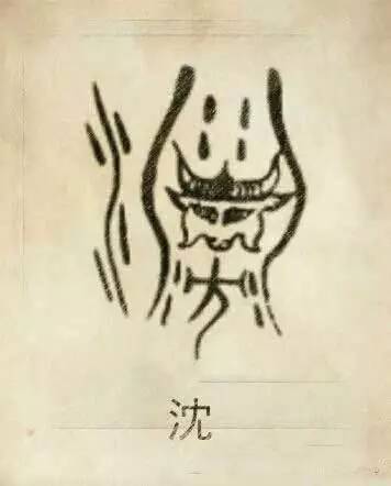 沈姓图腾,沈姓是以牛为图腾的氏族用牛沉河、渊、祭天求雨的巫觋职司,作为族徽,所以由水、渊、牛、方构成。