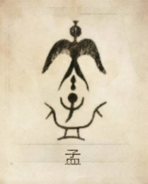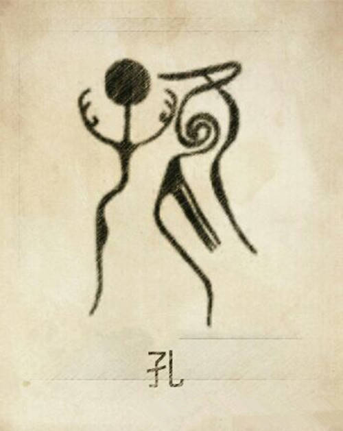 孔由左边人形的子,右边展翅飞翔的玄鸟组成。子得于“玄鸟殒卵”的传说。