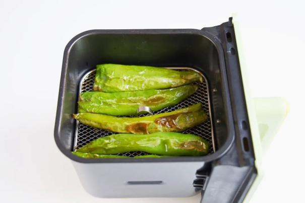 还有擂辣椒皮蛋,虽然辣椒不需要油炸,但需要小火慢煎,比较耗时。这时候也可以刷上一层薄油,扔进空气炸锅里,180℃,12-15分钟,出来的辣椒已经有一点虎皮,再和皮蛋一起擂碎就好了。